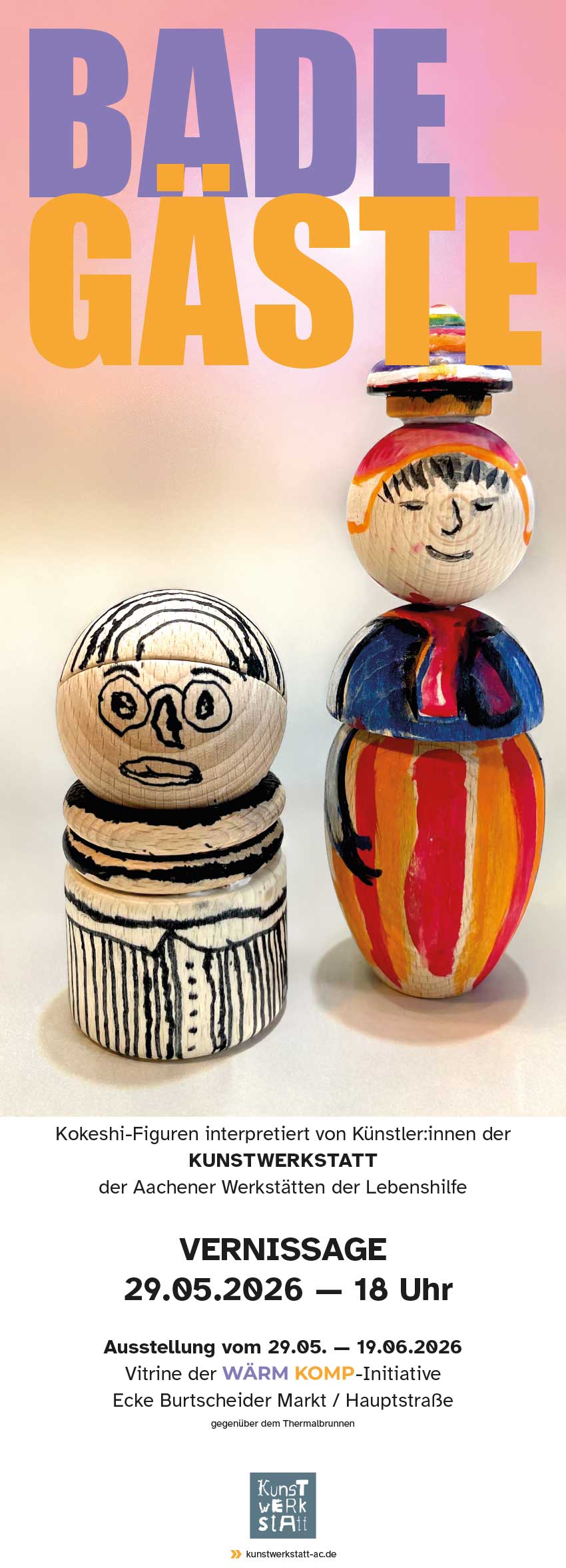 Gezeigt werden handbemalte Holzfiguren inspiriert von den japanischen Kokeshi-Puppen, die traditionell in den Badeorten — den sogenannten Onsen — gefertigt und als Glücksbringer weitergegeben werden. Die Figuren der Künstler:innen der KUNSTWERKSTATT sind zu Gast in der Vitrine der WärmeKomp-Projektgruppe (https://www.waermkomp.jetzt) einem besonderen Ort, an dem es sichtbar dampft und die Energie des warmen Wassers spürbar wird. Seit einiger Zeit lädt dort zudem ein öffentliches Fußbad zum Verweilen ein … im Aachener Dialekt wird die Badeschüssel „Komp“ genannt. Die lebensfrohen, künstlerisch gestalteten Holzfiguren stehen für ein offenes und vielfältiges Miteinander an einem traditionsreichen Ort. Zugleich erzählen sie von der Sehnsucht nach lebendigen Badeorten — und von der Hoffnung, dass bald wieder viele „Badegäste“ das warme Burtscheider Thermalwasser genießen können. Ihre Lieblingsfigur(en) können Sie direkt erwerben! Ein buntes Stück Kunst zum Mitnehmen — und ein Gruß an die heißen Quellen von Burtscheid.